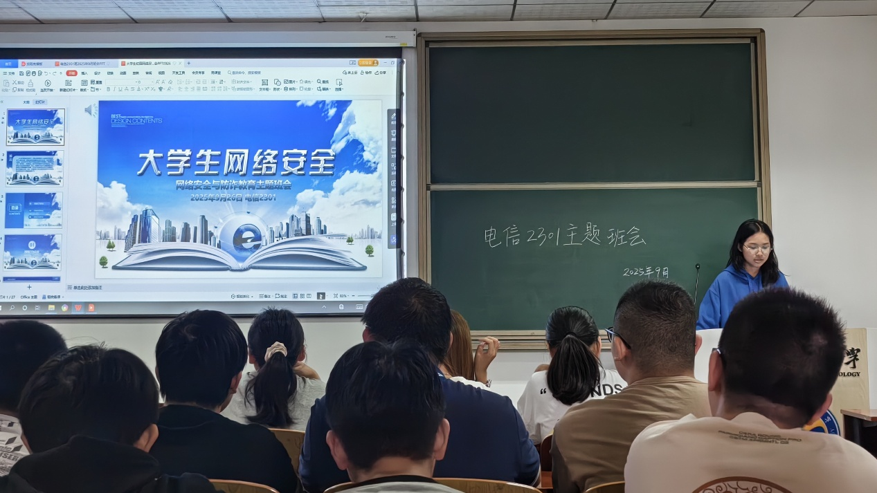 为了切实增强班级同学网络安全防范意识,有效规避电信网络诈骗风险,同时帮助同学们明确大学学业目标、规划未来发展路径,凝聚班集体向心力,电信2301于9月26日14点在爱特楼104教室组织开展了网络安全与防诈教育主题班会暨学业规划分享会,班会由班长朱佳欣同学主持召开,班主任胡德明老师全程参与并指导,全班同学共同参加。