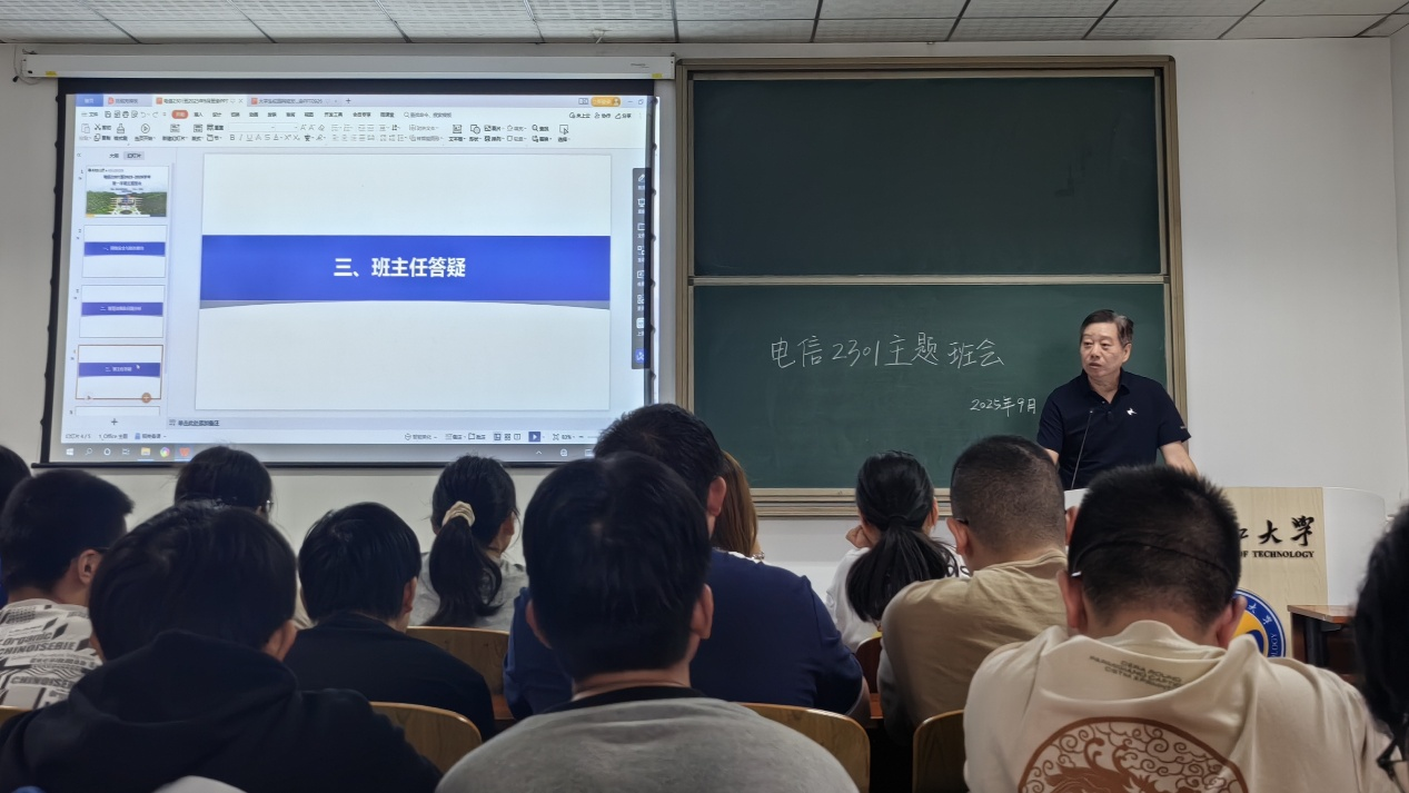 随后进入学业规划分享环节,胡德明老师结合电信专业特点与自身经验,为同学们提供了针对性指导。班主任首先分析了电信专业的课程体系,建议大家继续努力学好专业课提高成绩,为后续专业学习铺路;针对就业还是考研的疑问,班主任分别解读了两条路径的优势与准备方向,就业需提前积累实习经验,关注企业对编程、项目实践能力的要求;考研则要明确目标院校与专业,合理规划复习时间,平衡专业课学习与备考进度。此外,班主任还鼓励同学们积极参与学科竞赛、科研项目,提升综合能力,根据自身兴趣与优势制定个性化规划,避免盲目跟风。