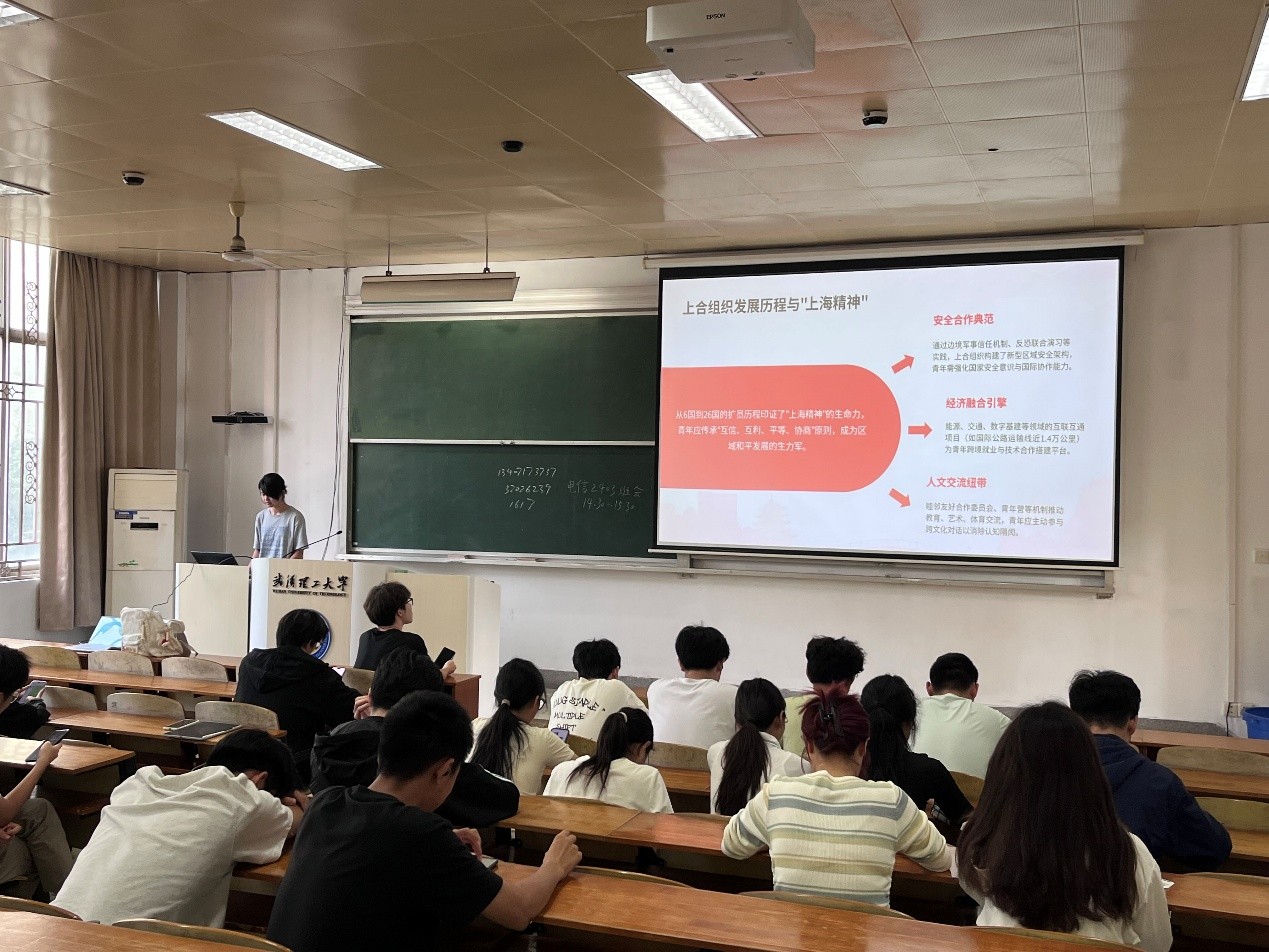 活动伊始,团支书柳展扬带领全体团员重温了习近平总书记的重要讲话内容。总书记深刻指出:“回首来路,尽管乱云飞渡,我们践行‘上海精神’而取得成功。展望未来,世界动荡变革,我们仍须遵循‘上海精神’,脚踏实地砥砺奋进,更好发挥组织功能。”这一重要论断为新时代青年拓展国际视野、服务国家战略、融入全球治理提供了根本遵循。