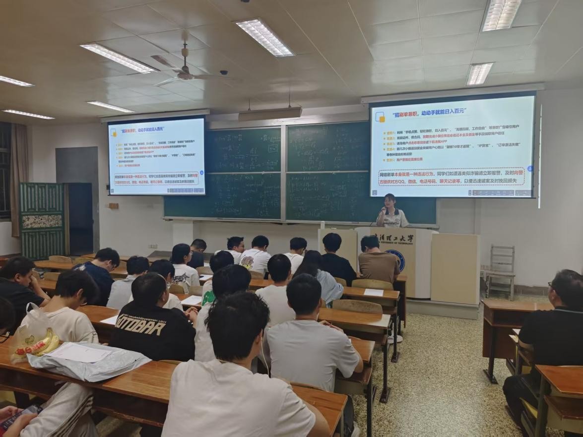 随后,她展示了近年来全国及高校周边发生的电信诈骗数据,用直观的数字让同学们意识到电信诈骗并非遥远的新闻,而是可能发生在身边的安全隐患,迅速引起了同学们的重视。冯晨灵为同学们详细讲解了电信诈骗的常见类型,她通过图文对比,逐一拆解了针对大学生的高频诈骗手段,清晰梳理了每种诈骗的话术套路与迷惑点。