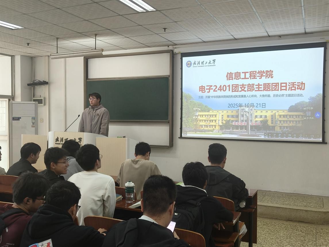 为引导团员青年深化对中华民族共同体意识的理解,凝聚 “中华民族一家亲”的青春力量,电信2401团支部于10月29日12:00于爱特楼102教室开展“民族团结一家亲,共筑中华民族共同体”主题团日活动。本次活动由团支书曹继升主持,电信2401团支部全体成员参与。