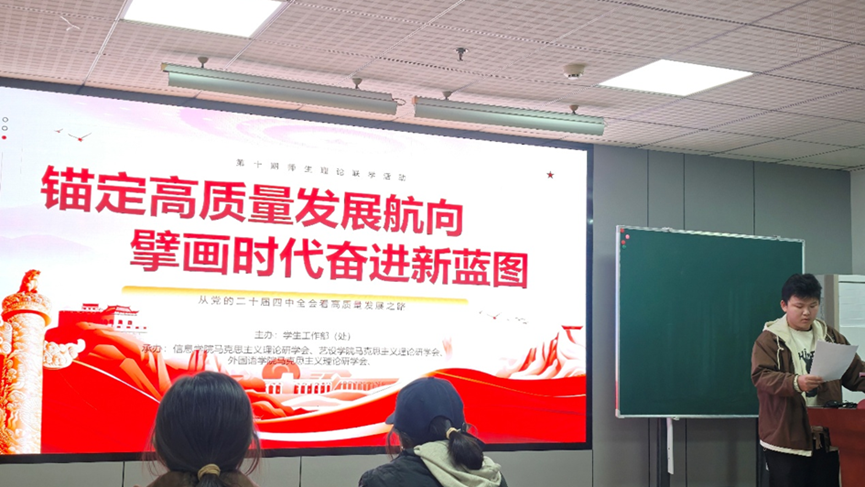 为深入学习党的二十届四中全会精神,锚定高质量发展航向,凝聚师生奋进力量,第十期师生理论联学活动于11月28日在爱特楼1602报告厅顺利召开。马克思主义理论研学会信息学院分会、艺术学院分会、外国语学院分会与指导老师马行健共同参与本次活动。