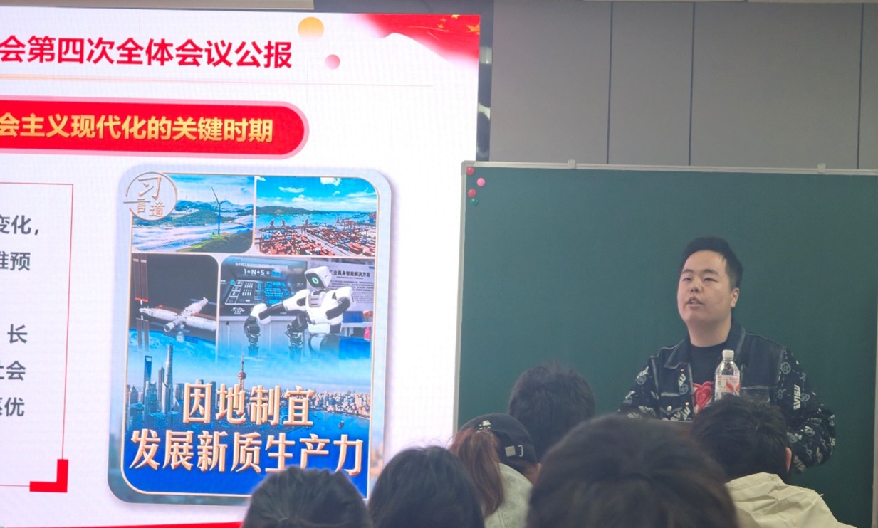 活动伊始,一段浓缩了党的二十届四中全会内容的视频,从发展成就到未来规划,为学子们带来深刻的思想启迪,引领学子们思考理解高质量发展的内涵。随后,马行健老师围绕党的二十届四中全会精神,回顾了我国发展历程中在经济实力、综合国力、科技实力等方面取得的非凡成就,并着重阐释了“十五五”时期作为基本实现社会主义现代化关键时期的重要意义。