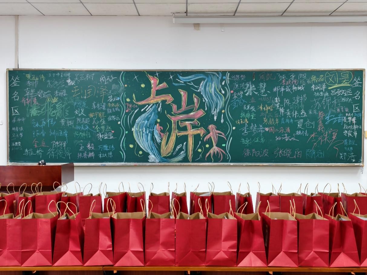 除此之外,学院还在爱特楼401教室精心布置了“考研加油打卡点”。教室黑板上绘制了寓意“锦鲤上岸”的彩色图案,寄托着对考研学子金榜题名的美好祝愿。现场还设置了签名墙,吸引了不少考研学子前来参与,他们或认真签名,或与黑板上的锦鲤图案合影,现场气氛温馨而热烈。