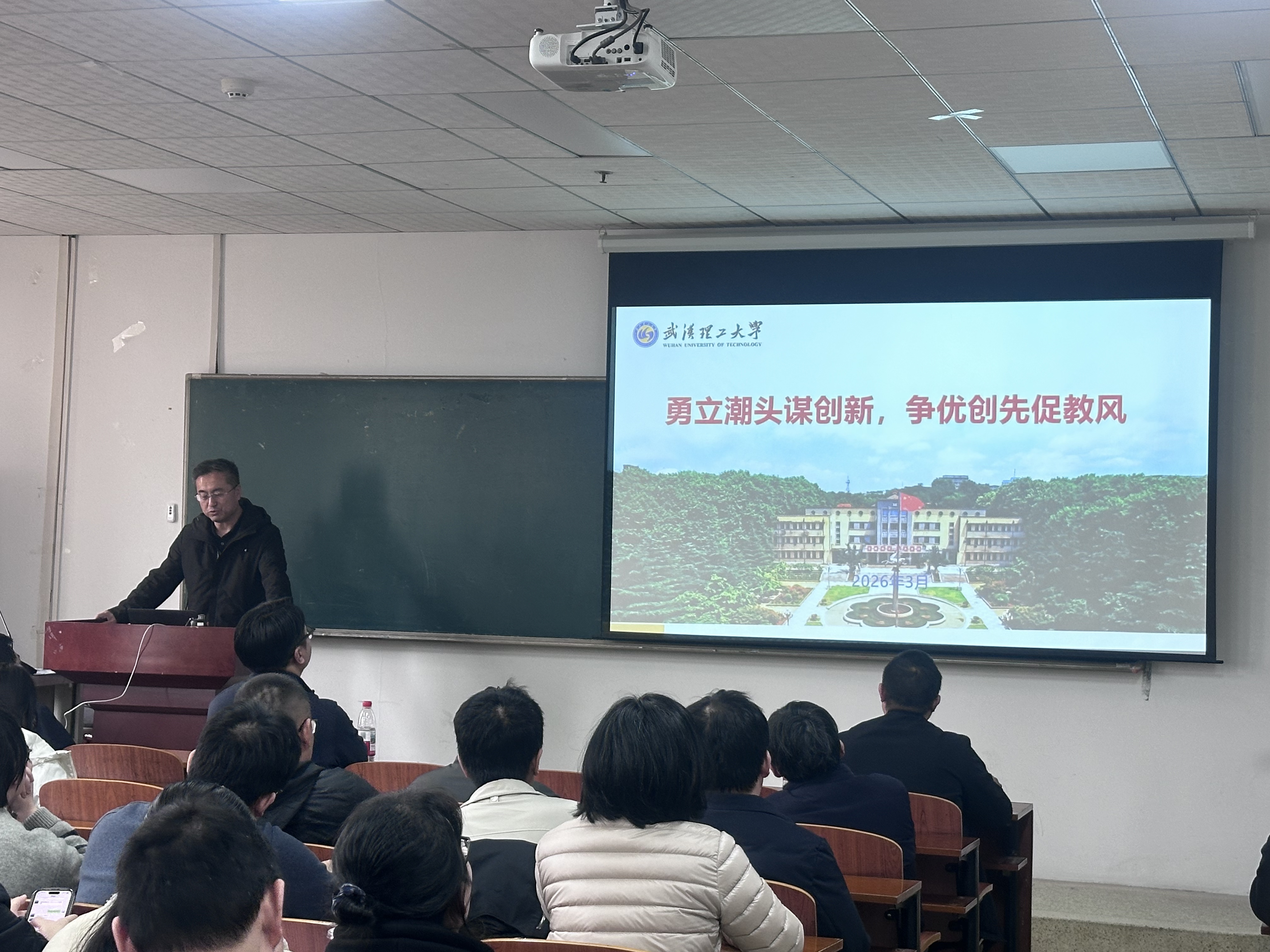 学院副院长郭志强以“勇立潮头谋创新 争优创先促教风”为题作汇报,围绕课堂教学工作作交流发言。他结合学院教风学风现状,引导全体教师重视课堂教学质量,坚守育人初心。他重点强调,要以“千军万马”的劲头争取质量工程,稳中求进、以进促稳。同时明确学院将为质量工程建设提供全方位支持,为教师开展教学改革、提升教学能力搭建平台、创造条件。