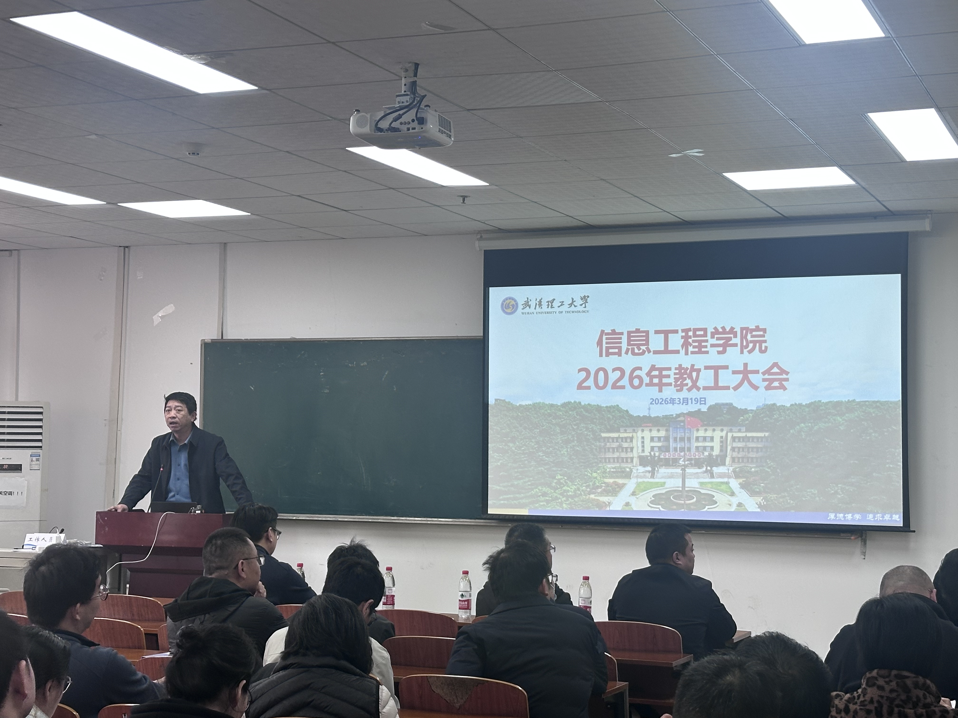 为对学校工作布置会精神进行再传达、再宣贯,确保学校党委一系列决策部署在信息学院落地扎根、起势见效,切实将学校工作政策传递到每一位老师,3月19日,信息工程学院在爱特楼401室召开2026年度教工大会,全面布置年度各项重点任务。信息学院领导班子成员,各系、中心和机关各科室全体教职员工参加大会,党委书记张虎主持大会。