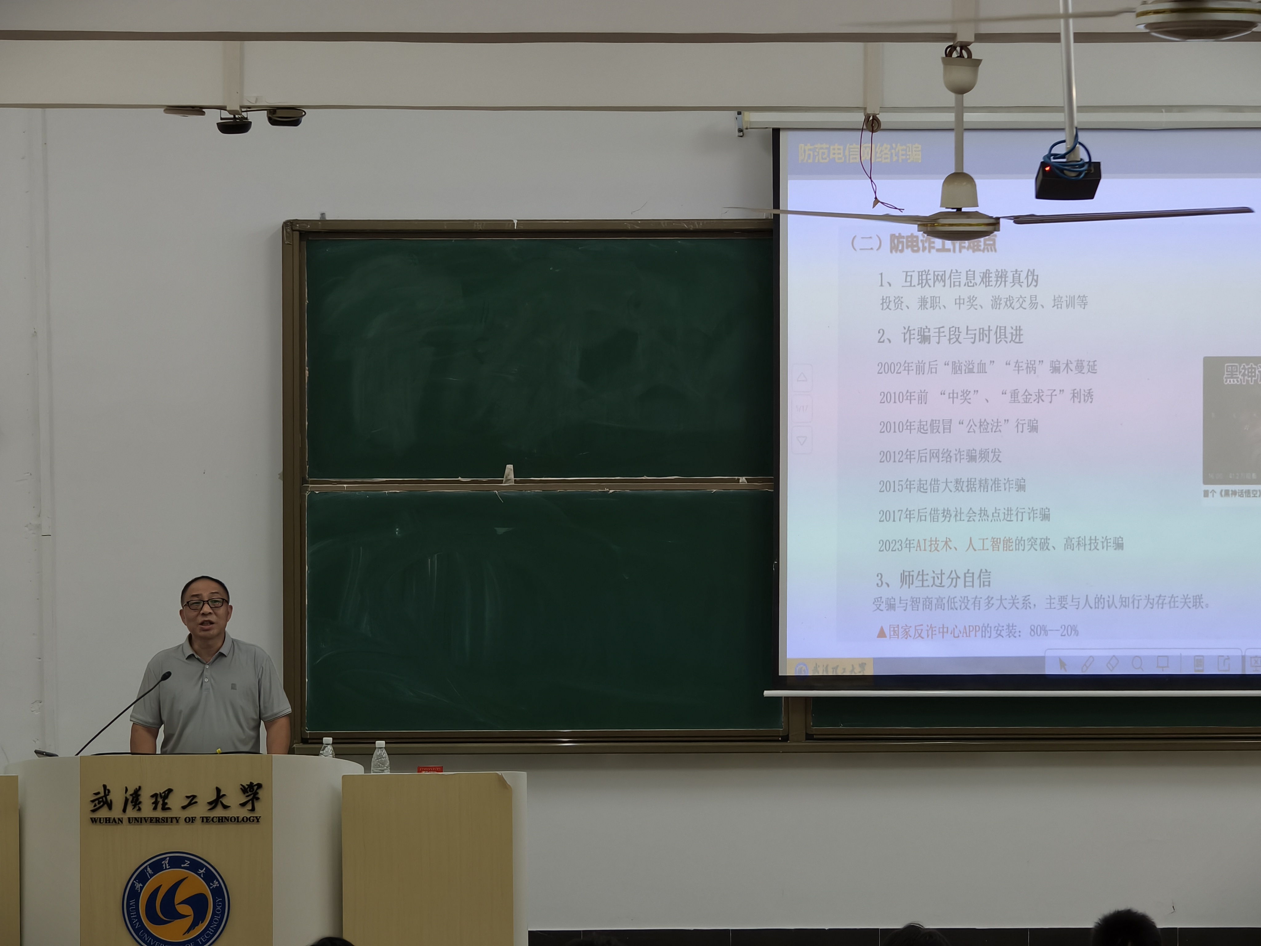 提升风险意识,筑牢安全稳定防线。保卫处易军主任以安全和法治教育为主题,重点强调了防范校园诈骗的相关内容。易军主任详细介绍了诈骗分子常用的诈骗手段,提醒同学们提高警惕,增强自我防范意识,做到“不轻信、不转账、不透露个人信息”。同时,易军主任指出,校园作为公共开放场所,同学们应妥善保管个人财物,避免因疏忽大意造成不必要的损失。