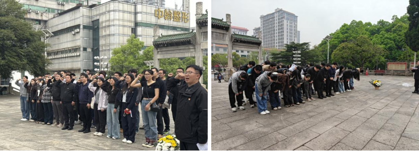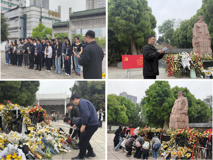 活动现场庄严肃穆,各位党员面向施洋烈士纪念碑肃立,向为民族独立、人民解放事业英勇献身的革命先烈默哀致敬。随后,师生整齐列队,党员代表缓步上前向纪念碑敬献鲜花,寄托师生对革命先辈的深切哀思与无限敬仰。最后,在学院党委副书记刘浩杰的领誓下,全体党员面向鲜红的党旗高举右拳,庄严宣誓。通过重温入党誓词,师生党员进一步坚定了传承红色基因、勇担时代使命的政治信念。